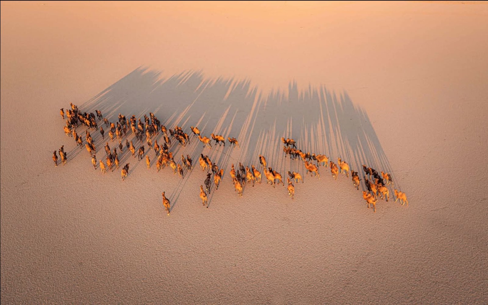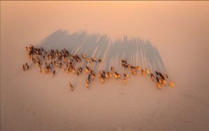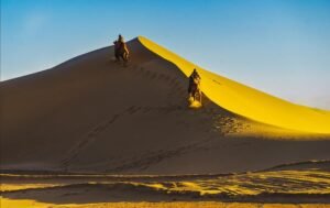 낙타 트레킹: 황금빛 모래 언덕을 배경으로 낙타를 타고 이동하며 유목민의 삶을 체험하는 것은 고비 여행의 정점입니다.