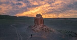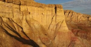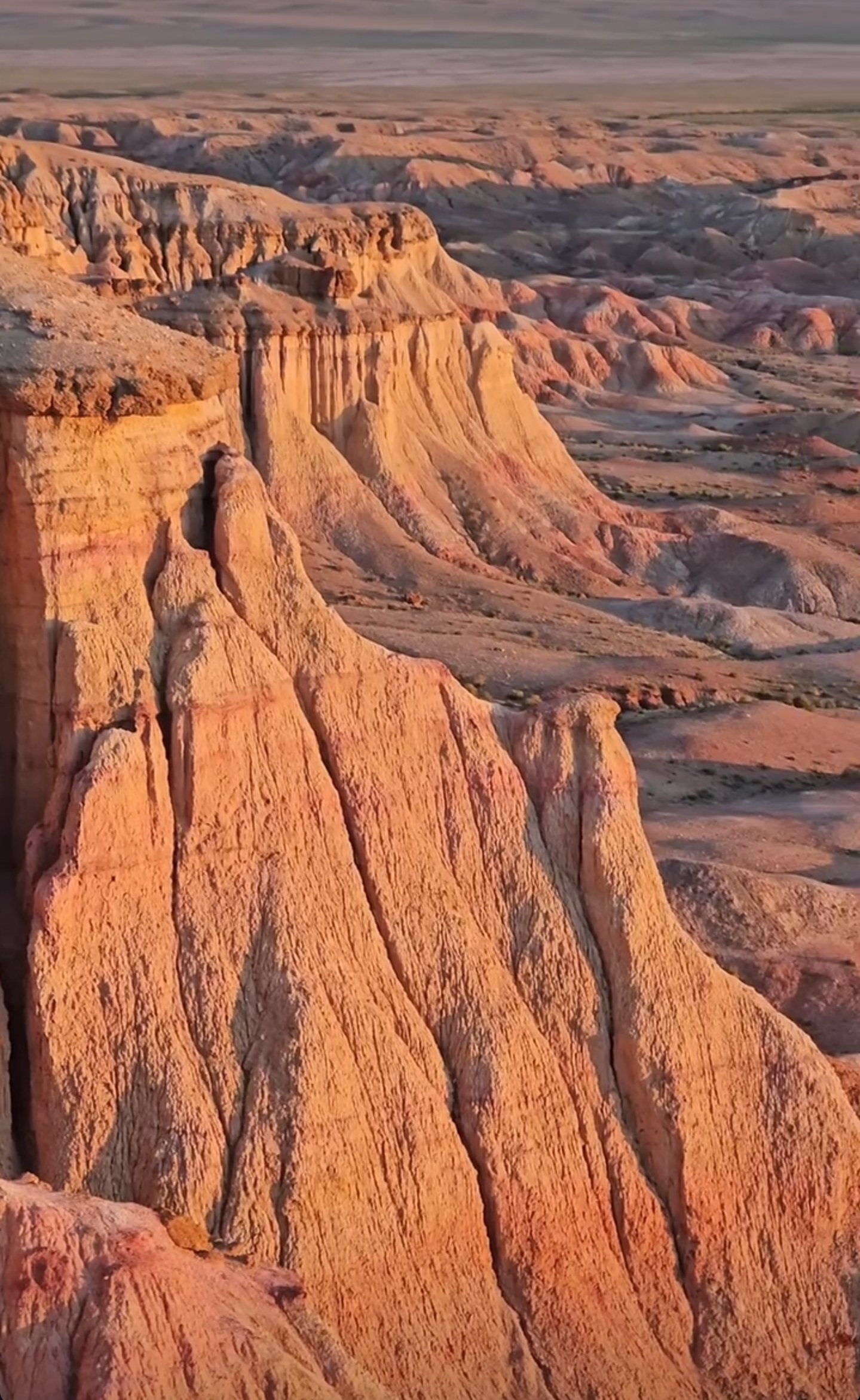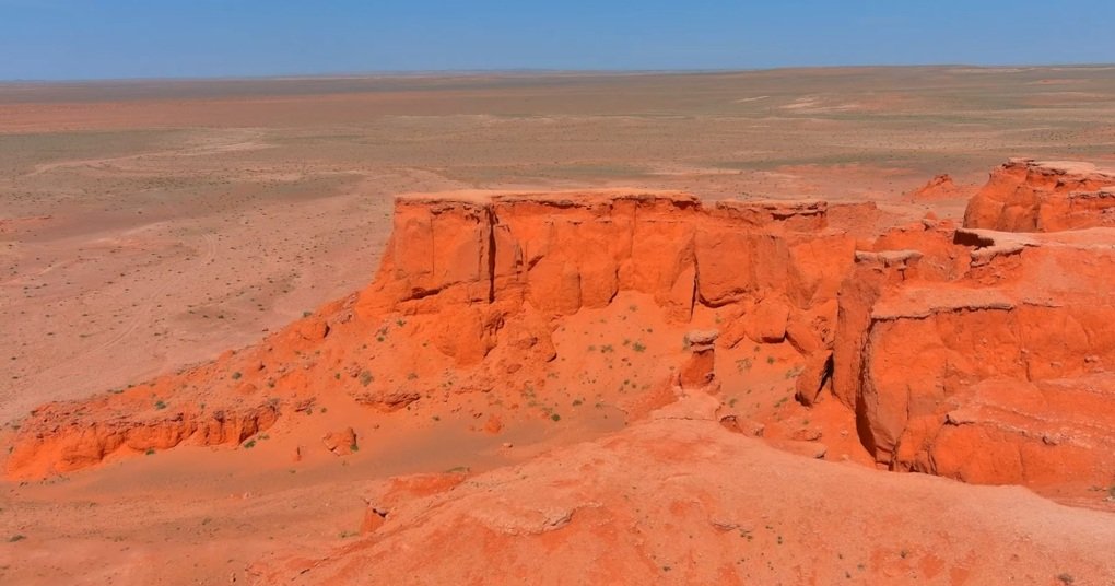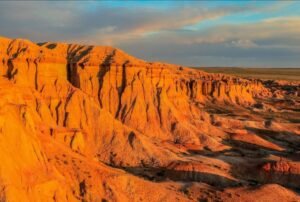 ‘사막의 덤불(Zag)이 많은 곳’이라는 뜻을 가진 바양작은 붉은 진흙과 모래가 쌓여 만들어진 거대한 절벽 지형입니다. 노을이 질 때 절벽 전체가 마치 불에 타는 듯한 붉은색으로 빛난다고 하여 서양에서는 **’불타는 절벽(Flaming Cliffs)’**이라는 이름으로 더 잘 알려져 있습니다.